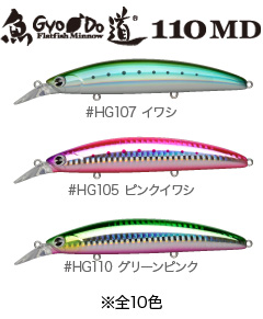 魚道110MD(ギョドウ110MD)[全長]110mm[重量]19g[タイプ]フローティング[レンジ]MAX1.5m[アクション]ウォブンロール[フック]ST-46 #6[リング]オリジナル#3[価格]2,100円(税抜2,000円)